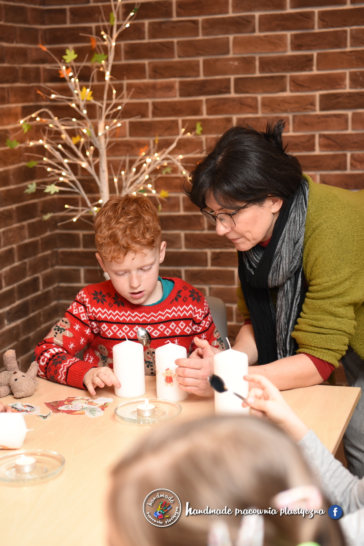 Zatapianie motywu serwetkowego w świecę, to kreatywny i prosty sposób na stworzenie pięknego, spersonalizowanego prezentu. W ramach zajęć plastycznych, uczestnicy mieli okazję wybrać jedną z wielu dostępnych serwetek ze świąteczno - zimowym wzorem, aby stworzyć swoją własną, unikalną świecę.